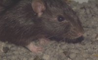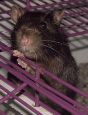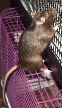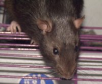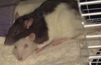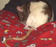 | The hooded girlie on the top of "Shaved Paw Girlie" is known as "My Sweet Sensitive Little Girlie" (or something equally as pathetically cute as that) She was the caretaker for both of ther older sisters before they died. Unlike Oreo, she's always been more calm and "lap puppy" like. Unfortunately, her mellowness and sweetness means that she's had a hard time with her sisters death. Her anxiety has manifested itself in overgrooming (to the point of scabs on herself) so she looks like she's a half hairless rat now. Hopefully the addition of two baby girls soon will snap her out of it. Otherwise, it's Prozac for Rats (tm). |
