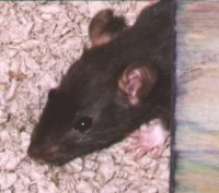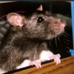 | Rose was Monchichi's "sister" - I'd bought her as a tiny baby from a pet store that was likely going to sell them for snake food in May of 1999. She was the epitome of unruly. She absolutely loathed being touched, despite all of my efforts from day one. She and Monchichi loved each other a great deal, however and they were both happy together. Like too many domestic rats, however, Rose developed Myco, an infection in the lungs and despite medication, was never back to normal. She passed away in September of 2000. |