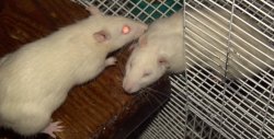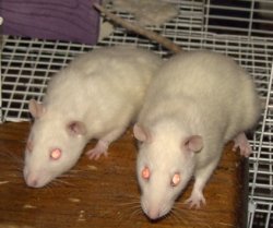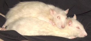 ![]() | These were the girls we adopted in August of 2000. Later to be known as "Shaved Paw Girlie" (Snow White, at the vet) and "Cute girlie bun" (Marshmellow, at the vet) each girl had her own personality. Despite being ill-bred petstore rats, both girls were absolutely wonderful and loving. Both girls were extremely smart and were overall, the best girls imaginable. |